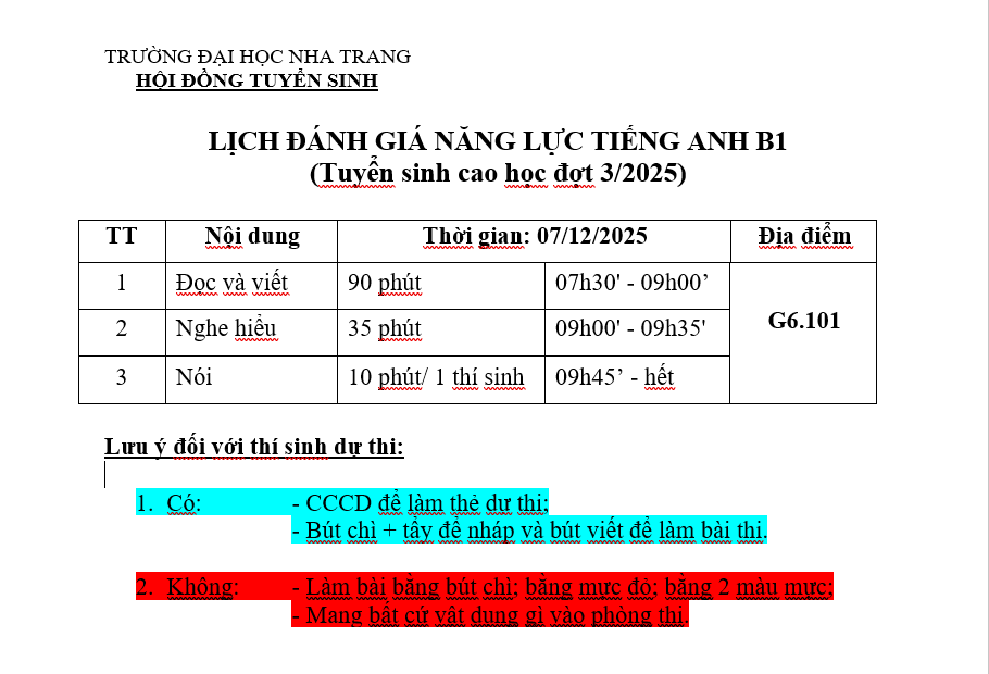 Thông báo lịch thi đánh giá năng lực TA đầu vào ngày 7.12.25