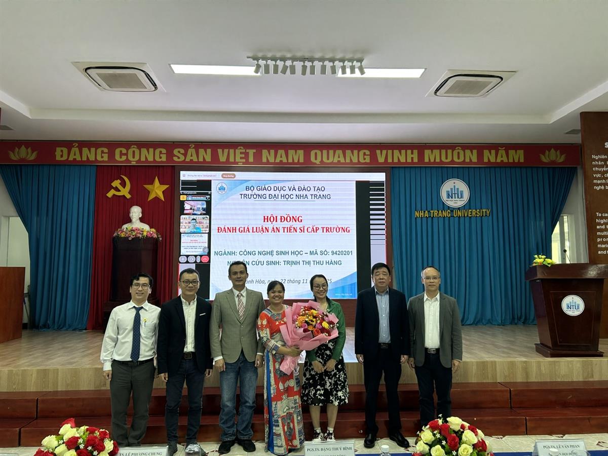 Ngày 22 tháng 11 năm 2025, tại Hội trường 1, Hội đồng Khoa học Trường Đại học Nha Trang đã tổ chức buổi bảo vệ luận án tiến sĩ cấp Trường: “Phân lập, tuyển chọn chủng Parvovirus tiềm năng cho sản xuất vắc xin phòng bệnh khô thai trên lợn” của nghiên cứu sinh Trịnh Thị Thu Hằng, dưới sự hướng dẫn của PGS.TS. Vũ Khắc Hùng và PGS.TS. Nguyễn Văn Duy.